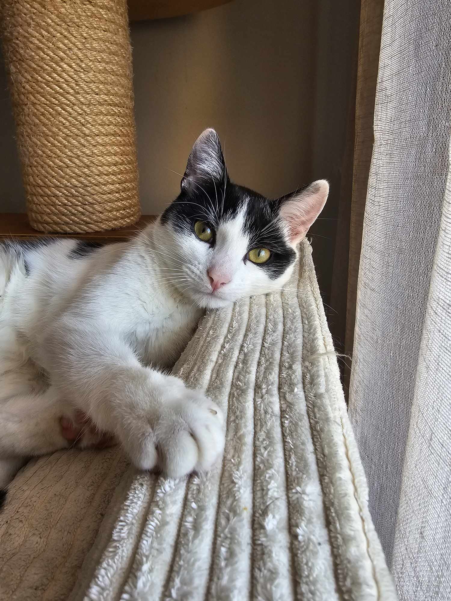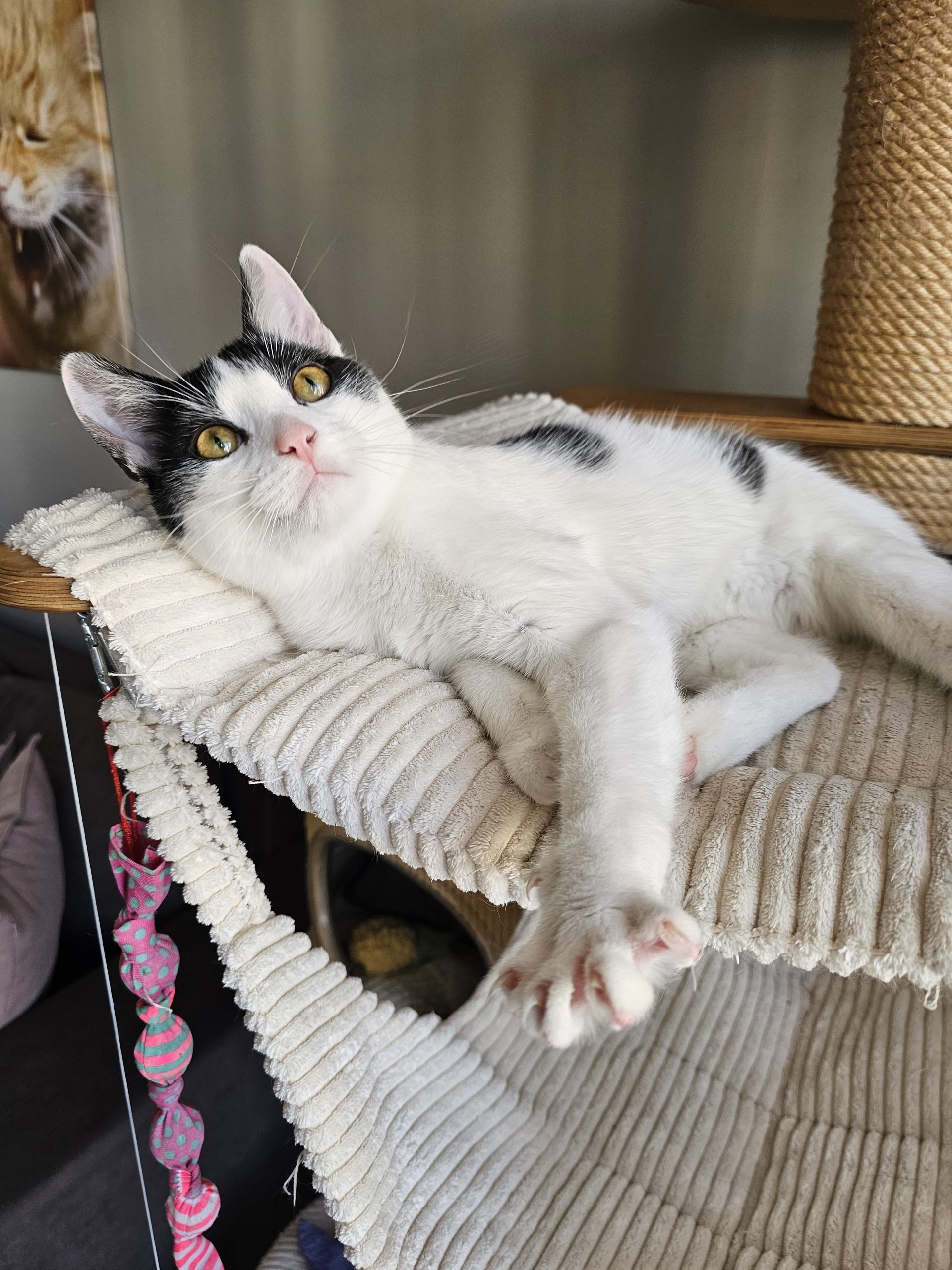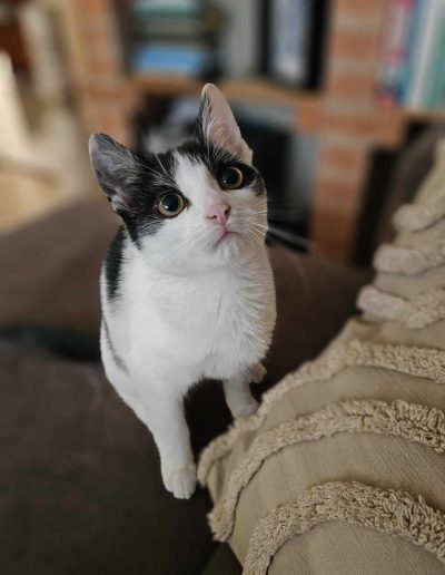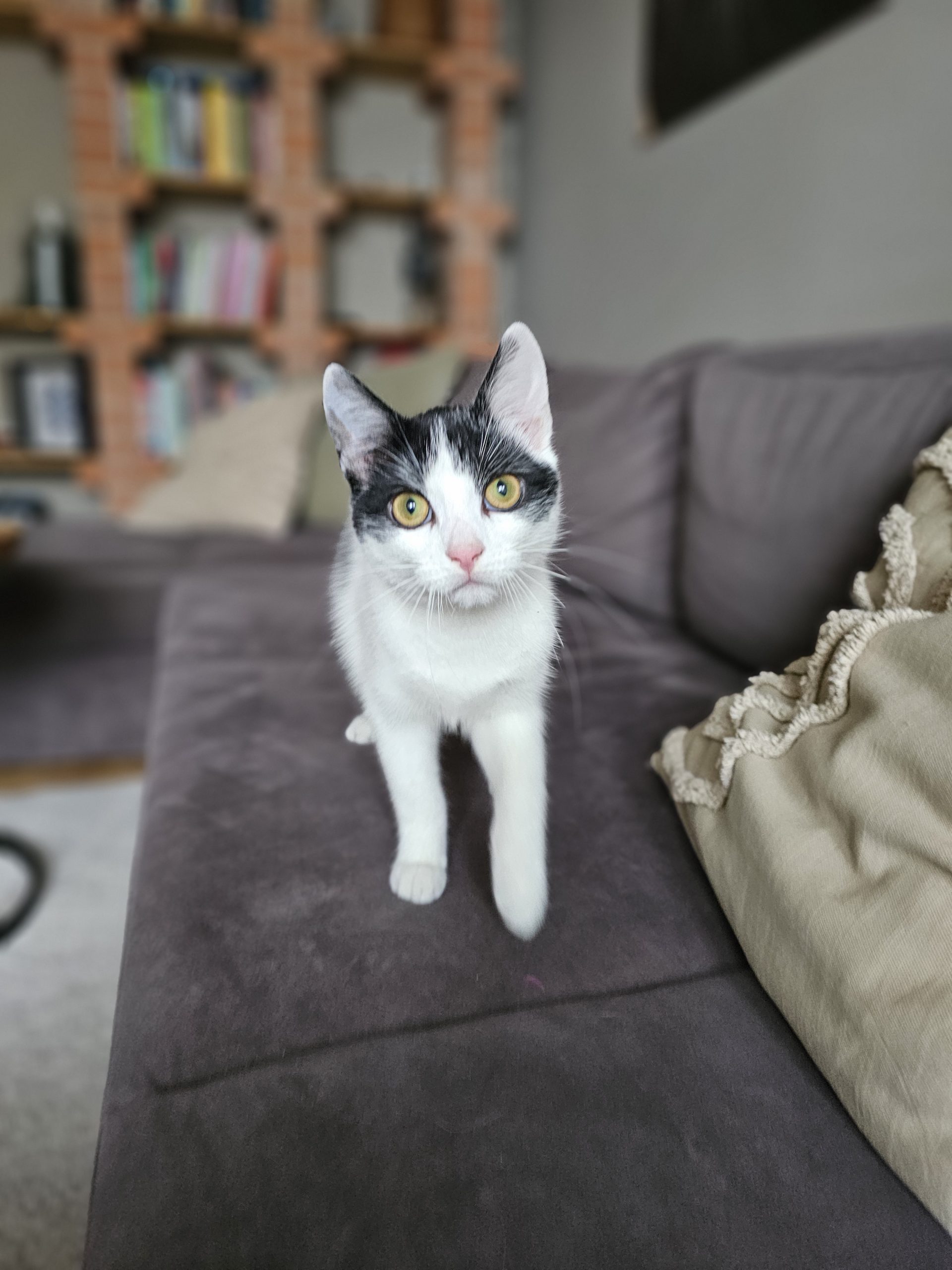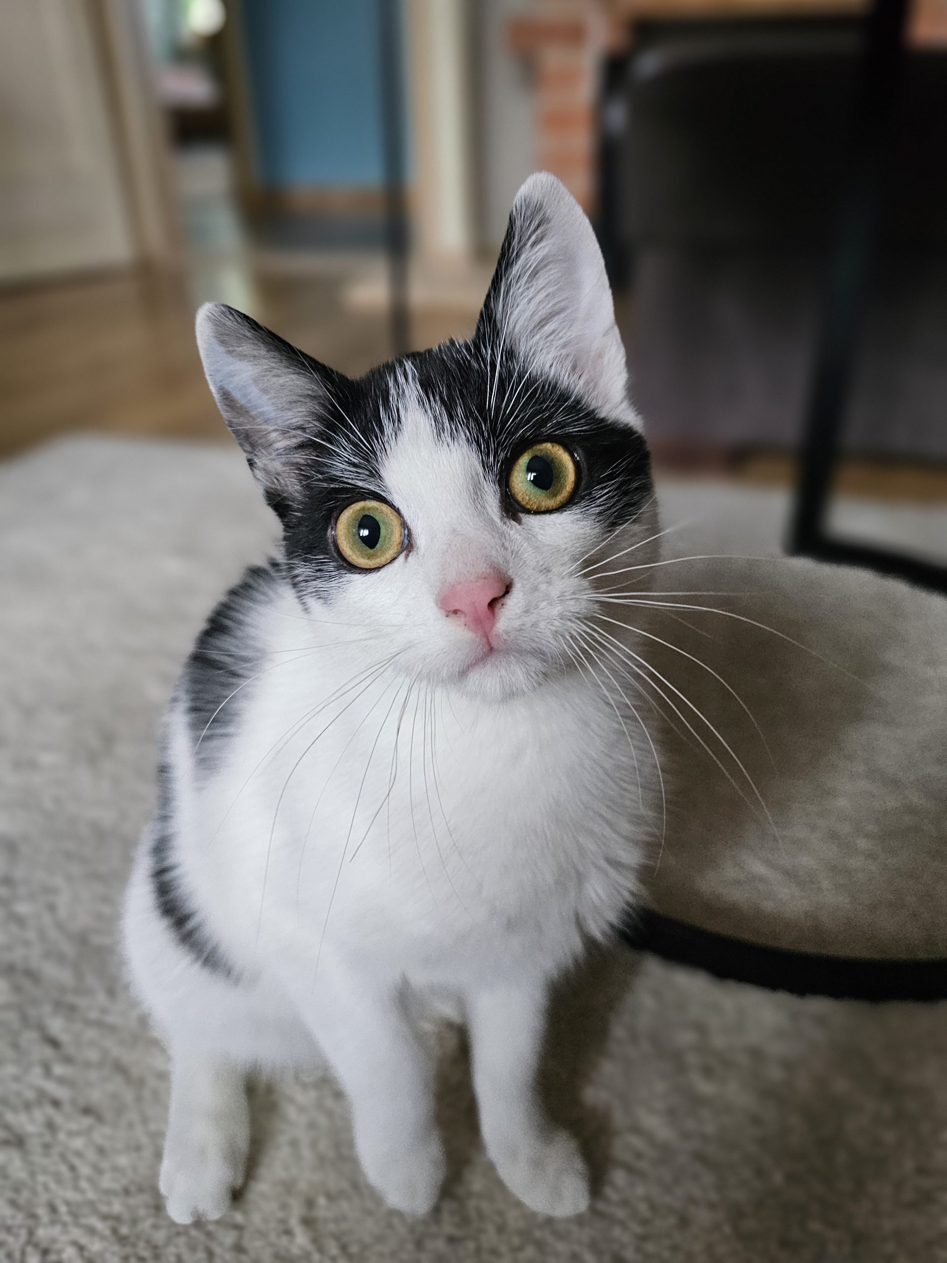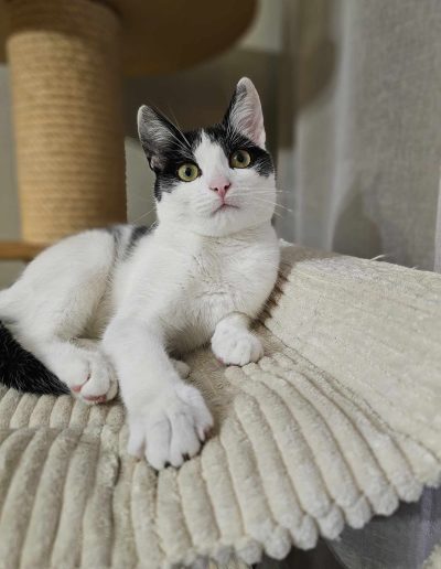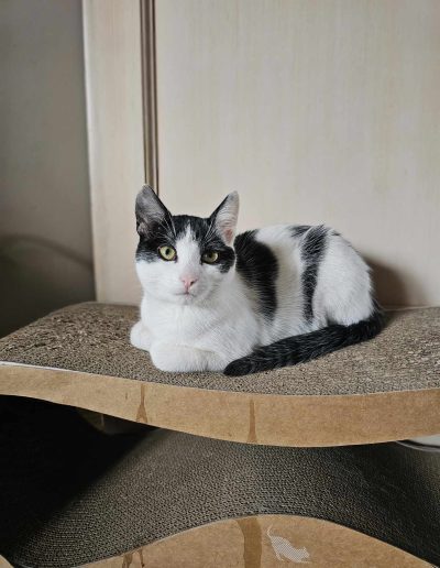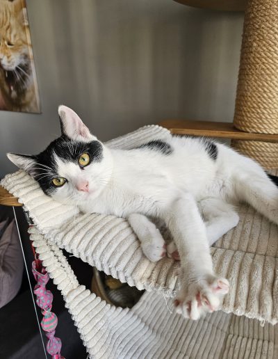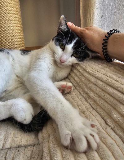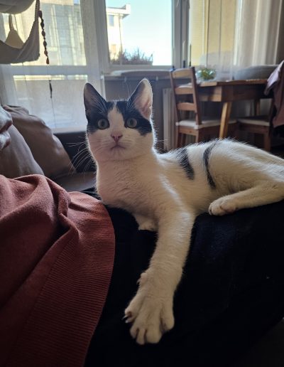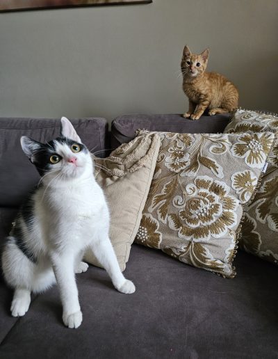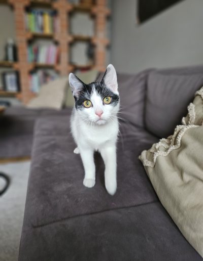 Bulion jest słodziakiem! Lubi inne koty, a szczególnie dobrze dogaduje się z Arnim, małym rudym brzdącem. Bulionik, choć w pierwszym kontakcie jest nieśmiały, to kocha człowieka – w szczególności jego kolana, na których robi piruety, fikołki i inne wygibasy.