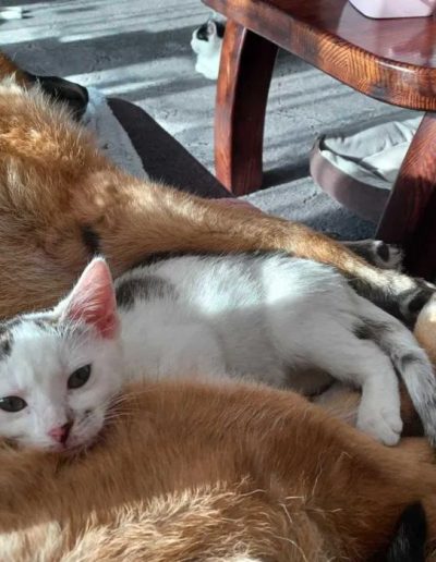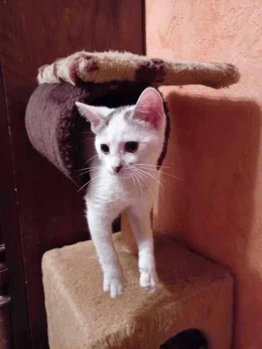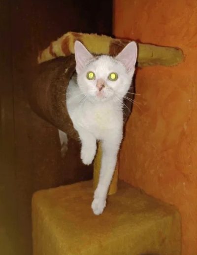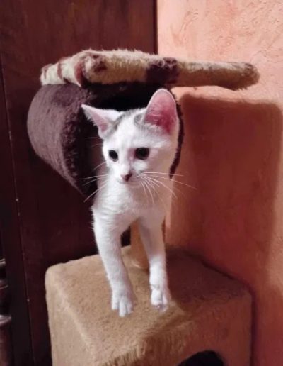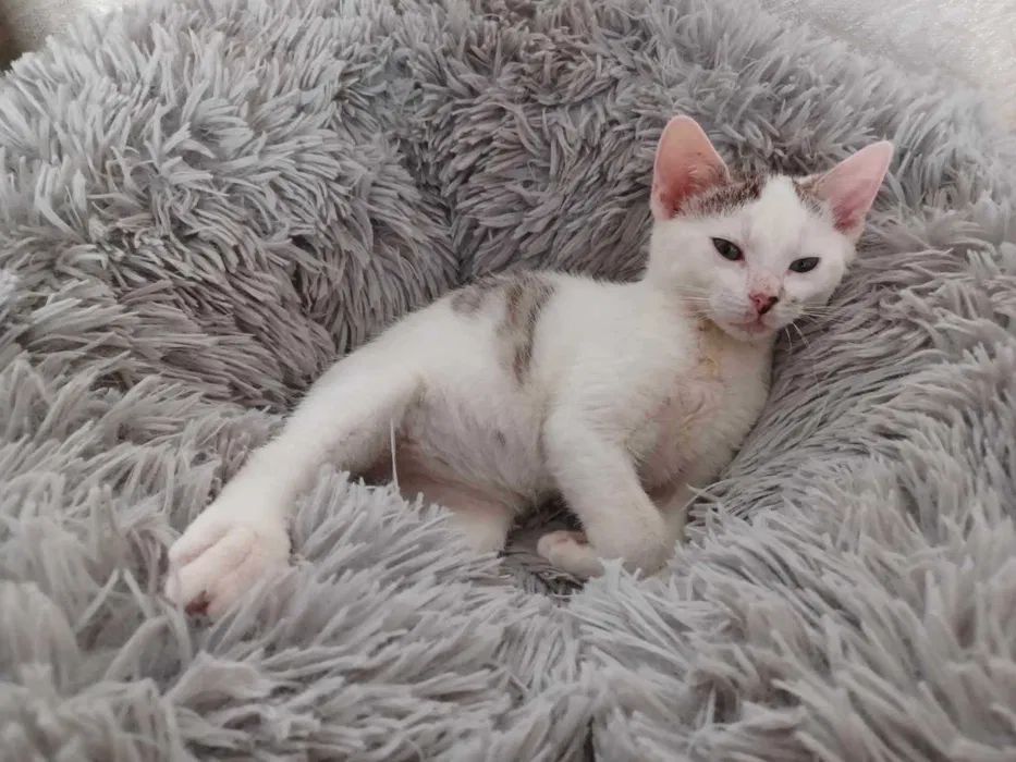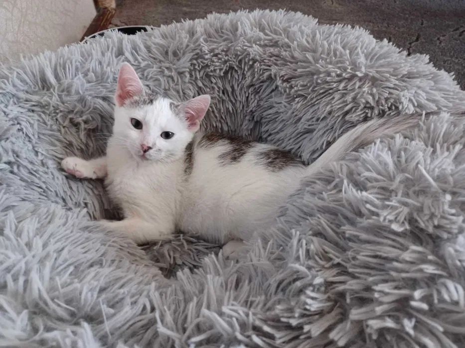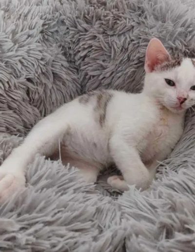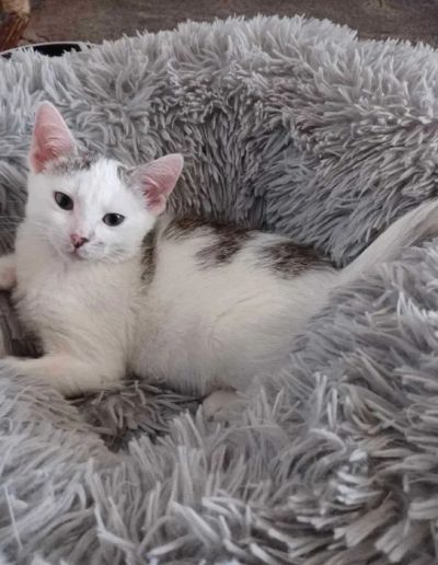 Ptysia vel Beza i jej siostra Pralinka to dwie maleńkie koteczki, które zostały zabrane ze schroniska w opłakanym stanie. Trzecia niestety nie doczekała ratunku. Obie były długo leczone i dzięki troskliwości i determinacji tymczasowej opiekunki Izy doprowadzone do stanu małego ślicznego i zdrowego kotka.